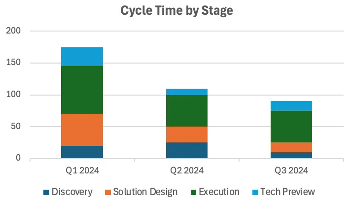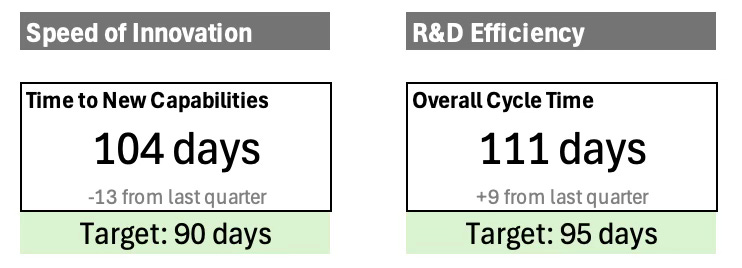 For example, an organization might aim for 90-days for achieving outcomes for major new capabilities while currently tracking at 104 days. Knowing this information enables the organization to identify bottlenecks and drive continuous improvement.