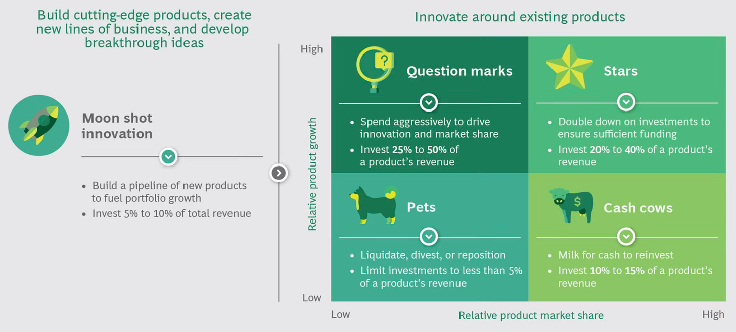 The BCG's growth-share matrix framework offers another approach, categorizing products into 4 quadrants based on growth and market share. One of the advantages of the BCG framework is that is allows organizations to further refine their horizon investments: