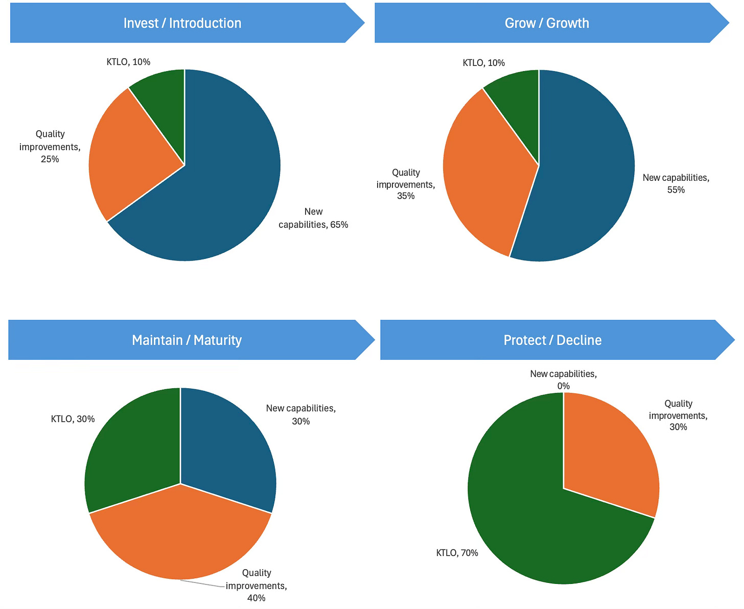 Investment allocations vary based on the product lifecycle stage and the context of the organization and products. The guidelines below show how investment allocations change as product mature in their lifecycle stage and should be adapted to the specific of your organization.