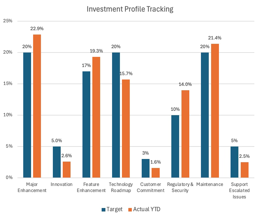 Using this level of instrumentation, portfolio teams can proactively manage and track their investment allocation aligned with their strategy and target allocation. Below is an example of detailed tracking for a mature product: