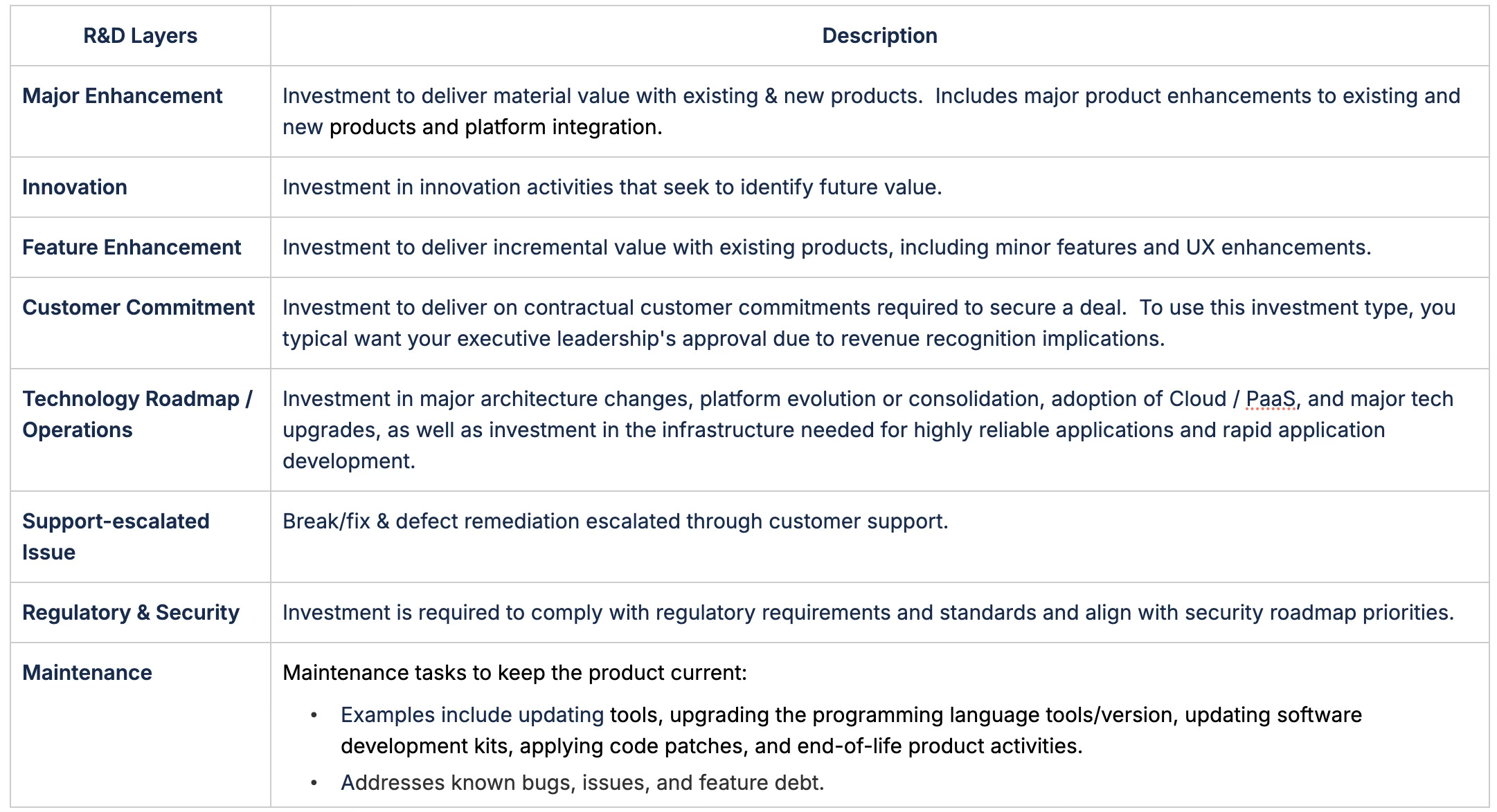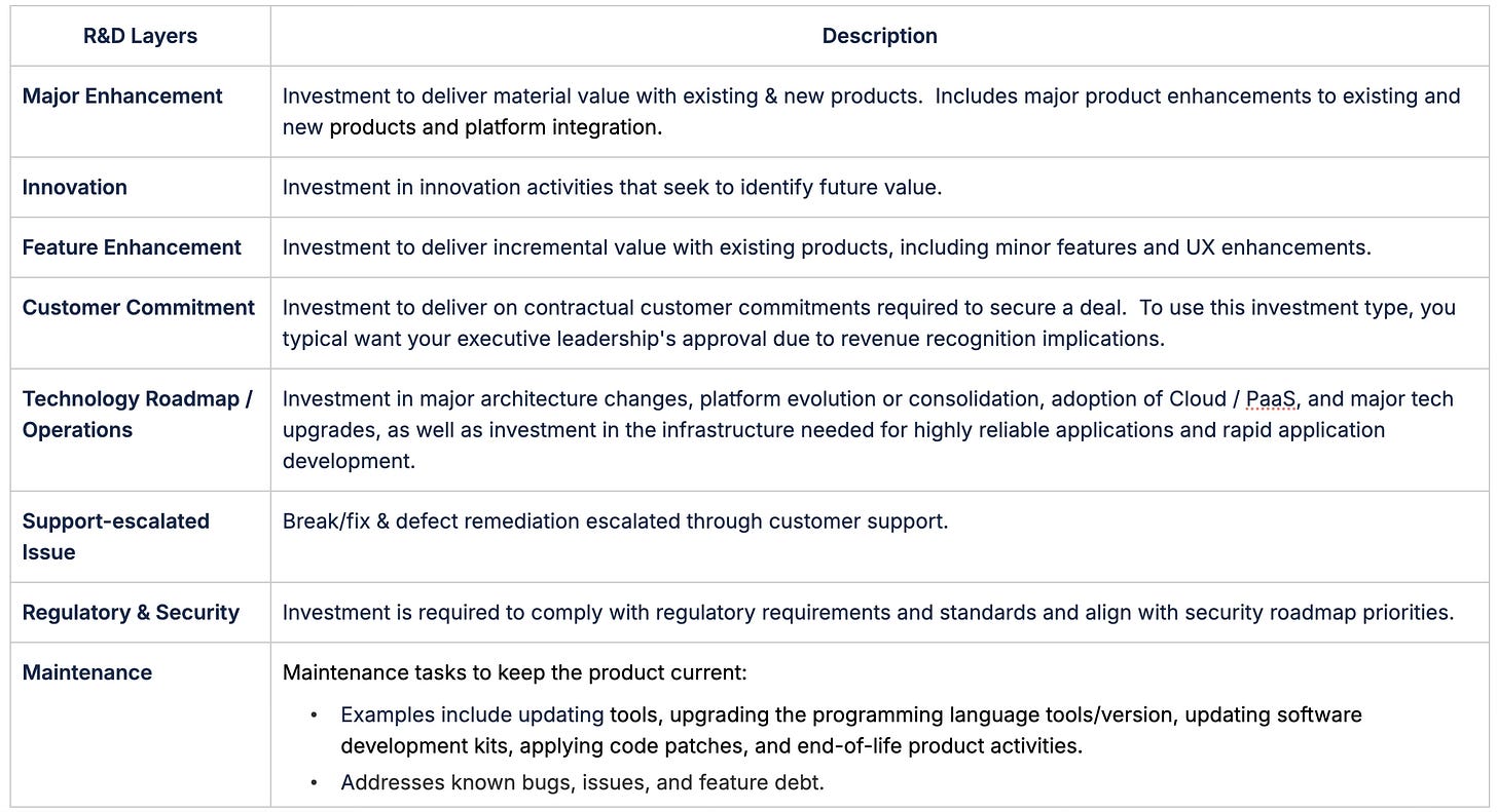 The Vista layer cake approach provides a disciplined methodology for managing product investment allocation, tracking actual investment vs. target, and ensuring a balance investment approach aligned with your portfolio goals. In this write up, we describes a slightly adapted version of the Vista layer cake framework.