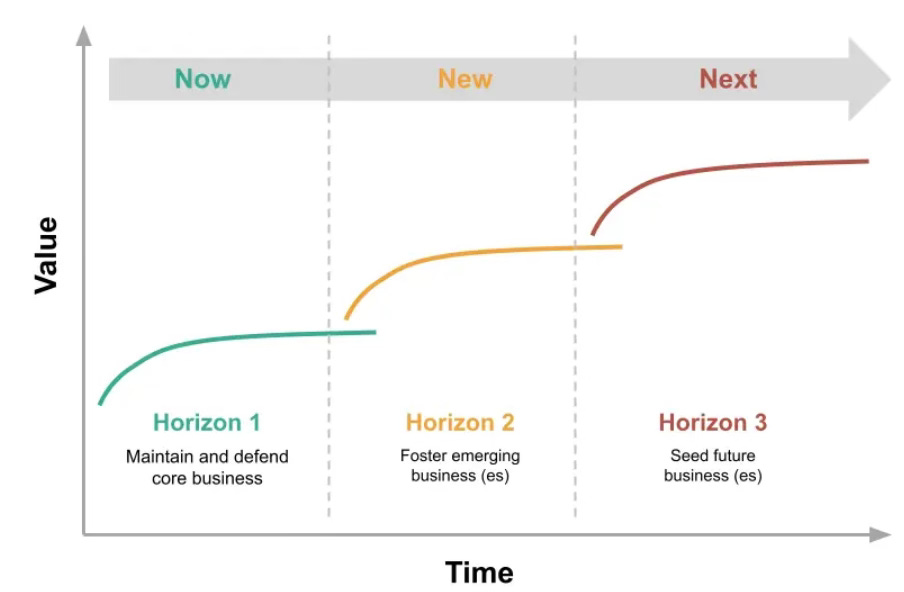 Horizon 3: seeds and invests in future businesses incubating new product concepts. Managed like seed-stage startups, with quick learning cycles and specific traction gates.
